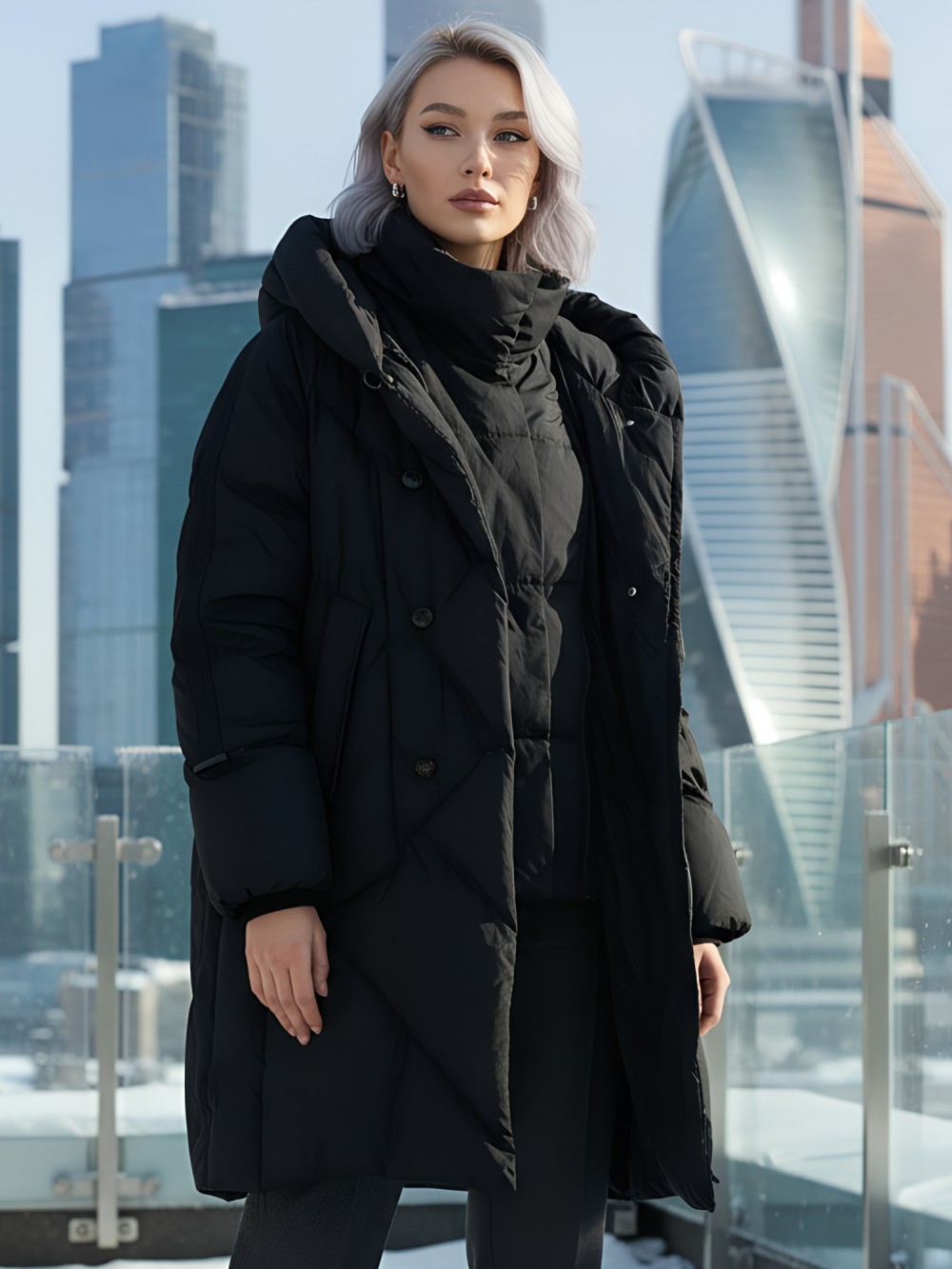 Роскошное зимнее пальто двубортное - ваш идеальный выбор для холодного сезона! Создано специально для женщин, которые ценят комфорт и элегантность в любую погоду. Представляем вам современное решение для зимнего гардероба - утепленное пальто премиум-класса, которое станет вашим надежным спутником при температуре от 0° до -25°C. Благодаря высокотехнологичной мембране с водонепроницаемостью 7000 мм, вы останетесь сухой даже в метель и дождь. Уникальный крой пальто подчеркнет вашу фигуру, а удлиненный силуэт до колена создаст элегантный образ. Качественный синтепон плотностью 240 г/кв.м и весом от 400 до 580 грамм обеспечит непревзойденное тепло без лишнего объема. Продуманные детали делают это пальто особенным: съемный стоячий воротник и несъемный капюшон для максимальной защиты, удобные магнитные карманы и внутренние отделения для ваших вещей, двойная молния с ветрозащитным клапаном, фиксаторы на капюшоне, рукавах и по низу для идеальной посадки, стильные декоративные пуговицы и кокетка подчеркнут ваш безупречный вкус. Доступные размеры от 46 до 54 и рост от 165 до 195 см позволят подобрать идеальную посадку. Выберите свой идеальный цвет: благородный коричневый, классический черный, нежный светло-коричневый или модный зеленый. Пальто из коллекции Осень-зима 2025 сочетает в себе последние технологии: быстросохнущий материал, надежная защита от ветра, водоотталкивающее покрытие, гипоаллергенные материалы, дышащая структура ткани. Это пальто станет вашим любимым выбором для офиса, учебы и повседневных прогулок. Наслаждайтесь комфортом и уверенностью в своей неотразимости каждый день! Успейте приобрести свое идеальное зимнее пальто прямо сейчас и встречайте холода во всеоружии!